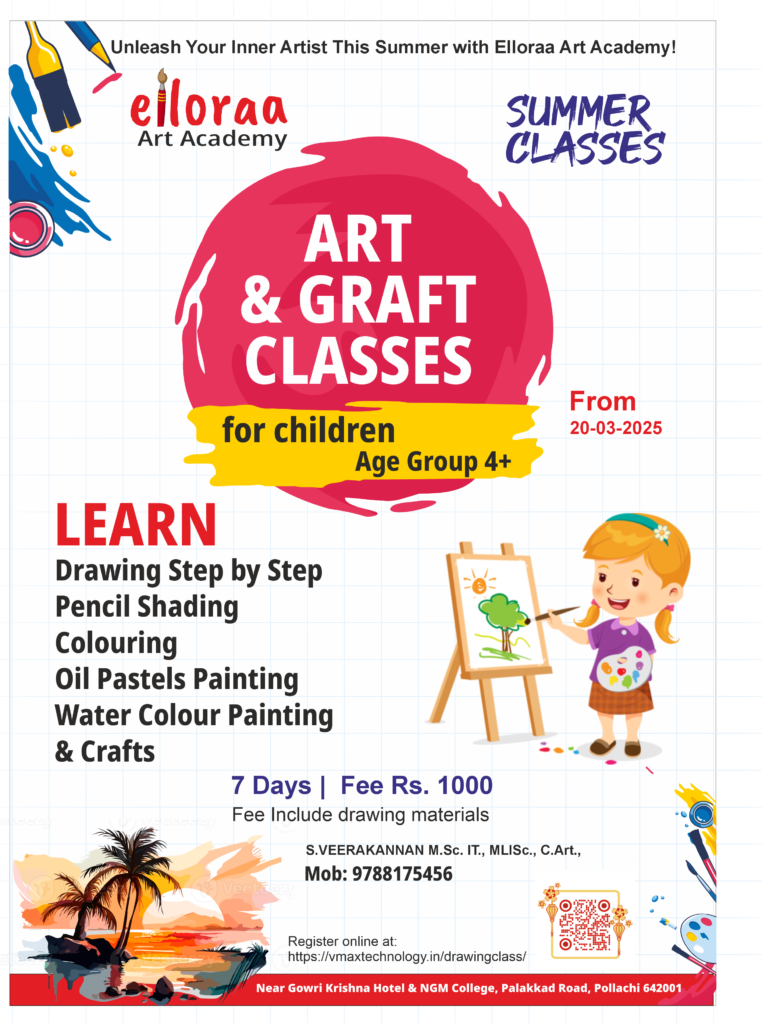 Pollachi, [Date of Publication] – School’s out and summer vacation is just around the corner! Looking for a fun and enriching activity for your children? Elloraa Art Academy is offering a fantastic 7-day summer drawing and art class designed specifically for students and kids, promising a creative and engaging learning experience.